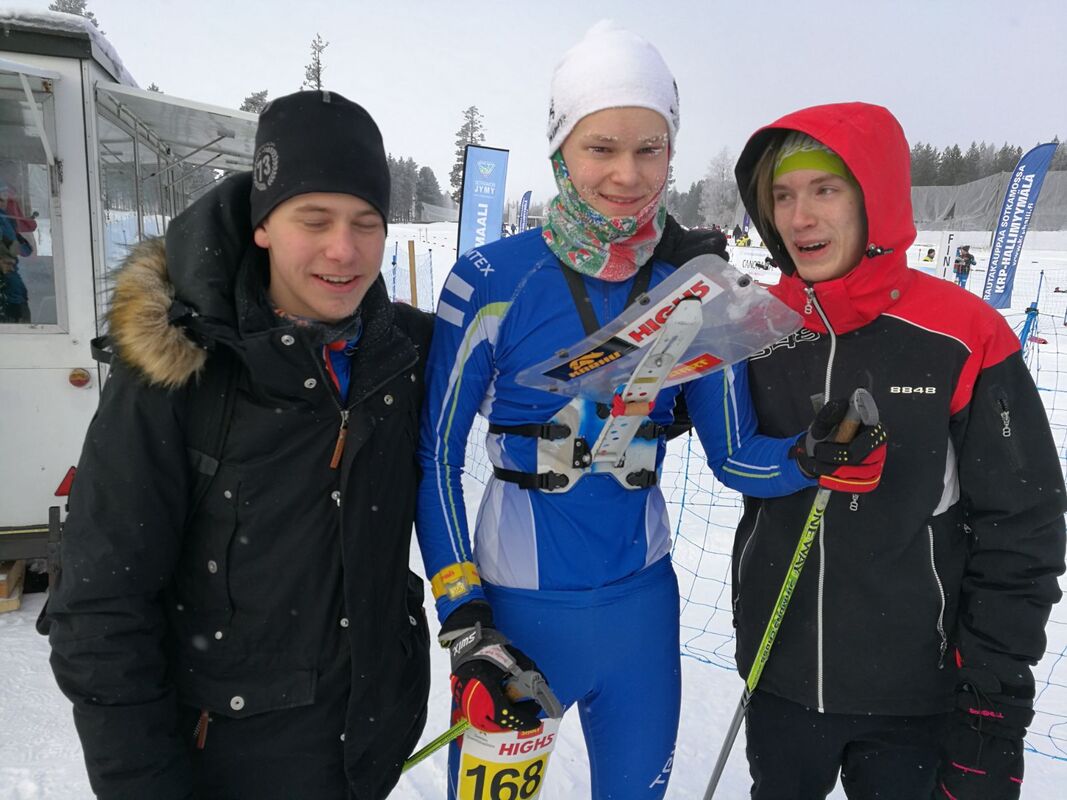 Vili Olkkonen, Antti-Jussi Oksa ja Vilhelm Toivonen hiihtosuunnistuvat viestikultaan Vuokatissa. Liitteet